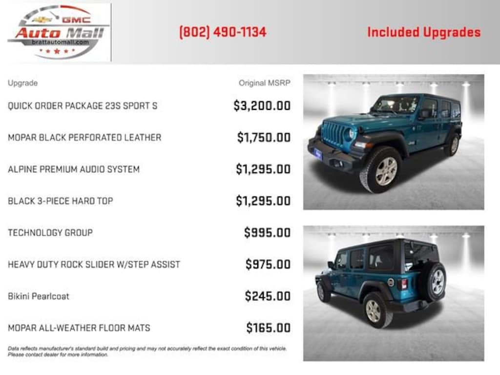 This 2020 Teal Jeep Wrangler Unlimited Sport S is well equipped and includes these features and benefits: Fresh oil change, Quick Order Package 23S Sport S, Technology Group, 1-Year SiriusXM Radio Service, Alpine Premium Audio System, Air Conditioning w/Auto Temperature Control, Front 1-Touch Down Power Windows, Remote Keyless Entry, Security Alarm, Speed Sensitive Power Locks, ParkView Rear Back-Up Camera, Automatic Headlamps, 220 Amp Alternator, Black 3-Piece Hard Top, 7.0 Touchscreen Display, Leather Wrapped Steering Wheel, Cluster 7.0 TFT Color Display.